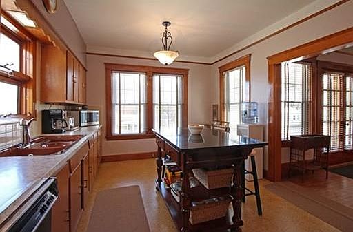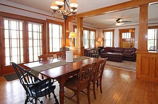 This adorable bungalow is nicely nestled on a corner lot with views from the multitude of sunshine filled windows. First floor boasts gleaming wood stretching from floors to built-ins to grand columns in the open concept dining / living room as well as fireplaced family room, spacious office, full bath and bedroom. Eat in kitchen is complete with double wall ovens, cooktop, dishwasher and refrigerator. Second floor has 2 additional bedrooms (one is a walk through) both with ceiling fans and an abundance of natural light. Basement is partially finished and an easy transition to additional living space. Bonus' are the covered wrap around porch and detached garage. Must see this one!