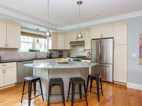 Meticulously crafted, luxury condominium on Somerville's prettiest street! Nestled midway between Davis, Porter and Union Squares, 3 Benton Road provides the perfect urban lifestyle. This home delivers a stunning and practical living space with tons of upgrades and a 2-car garage. The 750 sf "great room" was designed for daily life and hosting get-togethers with family and friends--a light-filled space with 10 windows, gorgeous views and subtle separations for living, dining, kitchen and custom built-ins. A beautifully appointed kitchen welcomes you with extra large island and 36-inch Bertazzoni gas range, vented hood, pot-filler, SS appliances and honed stone counters. The 13.5' x 19' primary bedroom with walk-in closet and en suite bath is impressive; 2 additional bedrooms, a 2nd full bath and w/d complete the interior. French doors open to the beautiful, private, 27 foot-long deck. Central AC, custom shades and shutters, 167 sf deeded storage. 2 T's; on bus line; near everything!