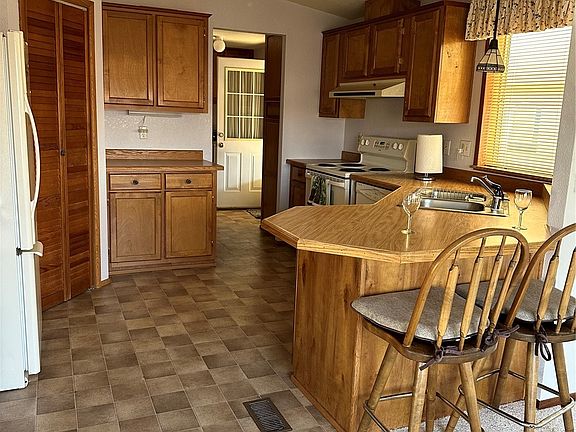 Well cared for home in Christmas Village. Enjoy this 55+ community and all that it has to offer. 2 bed, 2Bath,1352 sf home located near shopping and medical facilities. Nice Eat in kitchen with garbage disposal, breakfast bar and dining room. Modern sheetrocked home with a spacious and light filled Living room. Nice utility room. Primary bedroom has a large bathroom with a walk in tile shower and storage .The Den/Office could be 3rd bedroom. Roof is 7 years old. Outside Has storage behind the attached  carport and and private entertaining area attached to  low maintenance yard with drip irrigation!  New Heat and cooling  pump! All appliances stay. Clubhouse and fun events. Front Porch is another inviting area outside.