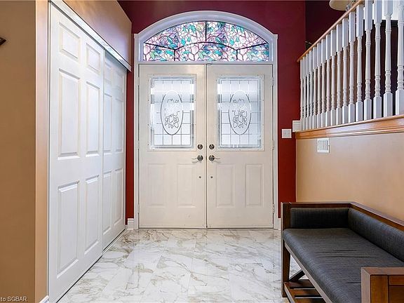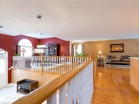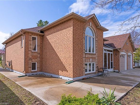 Spread your wings and soar to new heights of living in this harmonious all brick 5 bedroom, 3 bath raised bungalow, well-located in west end Wasaga Beach close to shopping, services and amenities including elementary schools, restaurants, trails and a 5-minute bike ride to the Georgian Bay shoreline. This spacious 3,831 sq ft (2,097 sq ft on the main floor) home sits on a landscaped 59 ft x 165 ft deep lot with a concrete driveway and concrete pathways surrounding the house, 2 garden sheds and a back deck accessed from e sunny breakfast nook. Heading up to the main level from a generous foyer with stunning porcelain floor, double coat closet and inside entry to the heated two-car garage, the open concept kitchen/dining/living area is bathed in light and perfect for entertaining friends and family. The artful pendant lights over the kitchen island highlight the stainless steel appliances and the warm glow of the hardwood floors flowing throughout the main floor and one of the bedrooms. The eat-in breakfast nook features large windows and patio doors leading to the back deck. Down the hall discover a spacious primary bedroom with a 5 pc ensuite bath and dream walk-in closet. Two additional bedrooms with the adjacent main 4 pc bath provide the "3 bedrooms on the main floor" on your wishlist. The finished basement is a delight to view, with the laundry room, 3 pc bath with tiled shower, 2 bedrooms and a huge family room with Napoleon gas fireplace, bar area and perfect layout for any stage of life.