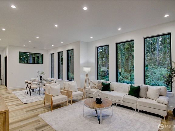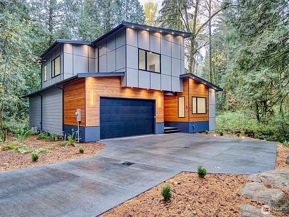 Wonderful luxury home located set back from the cul-de-sac on a private lot with natural forest land on 2 sides. The home has the Primary Bedroom & Office on the main level - along with an open kitchen, dining, and living room. Soaring ceilings complement the house throughout. The kitchen has stainless steel appliances, white cabinet package, and a massive island with quartz counter tops. The great room area is open, has a large electric fireplace as the centerpiece, and covered deck access with stairs down to the yard area. Large primary bedroom which has a spa-like bathroom with separate tub & glass enclosed shower. Large laundry room on the main level as well. Upstairs has a large Family Room; 2 guest bedrooms; & full bath.
