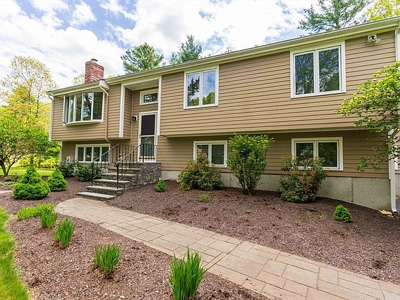 This oversized and meticulously maintained 4-bedroom raised ranch offers abundant and beautiful living spaces, set on a tree lined cul de sac abutting Borderland State Park. Enjoy a bright, open floor plan with cathedral ceilings, skylights, a gas fireplace and a wood burning fireplace, and gleaming hardwoods. The stunning chef’s kitchen features quartz countertops, stainless appliances, and a large island with open floor plan. The walk-out lower level offer a 4th bedroom, and flexible space currently enjoyed as a family room/guest room and a separate gym and half bath. Outside, relax on the elevated deck or paver patio overlooking lush, private grounds. Central air, modern updates, and direct trail access—minutes to Lake Massapoag, top schools, and commuter rail. If you are looking for a move in ready spacious updated home with access to Borderland State Park in your backyard, this is the one!