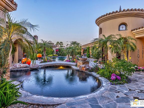Welcome to 3 Coronado, a custom-built Mediterranean estate offering the perfect balance of elegance, space, versatility, and luxe amenities. Conveniently located in the exclusive enclave of Coronado Rancho Mirage, just one mile from Eisenhower Medical Center, restaurants, and shopping, this completely walled and gated compound embraces upscale desert living at its finest. Situated on one fully landscaped acre, 3 Coronado serves up 7,600 square feet of living space with a total 4 bedrooms, 5.5 baths, and 8-car garage parking between the main and guest houses. Throughout, you'll appreciate the elevated craftsmanship and upgrades, including travertine tile, cedar-lined closets in all en-suites, solid core doors, wood shutters, Hunter Douglas remote shades, integrated speaker system, and an abundant use of marble and granite. Enter the property through the first rotunda to find an awe-inspiring serene oasis where water features, mature vegetation, and pristine architecture captivate the senses. In the distance, a breathtaking second rotunda transports visitors into the elegant main home which is designed for entertaining and relaxed family gatherings. Proceed to find a massive great room complete with dramatic coffered ceiling, gallery walls, and the first of four fireplaces. The dedicated bar area includes sink, refrigerator, wine cooler, dishwasher, and Sub-Zero ice maker. The formal dining room connects conveniently to the butler's pantry with sink, dishwasher, microwave, and easy access to the wine cellar. The jaw-dropping chef's kitchen features Wolf and Sub-Zero appliances and stunning walk-in pantry. Beyond the kitchen's breakfast bar, find a comfortable living room, dining area, laundry, and two beautiful en-suite bedrooms. The spectacular primary bedroom suite is located on the opposite side of the home offering wonderful separation and privacy. It showcases a double-sided fireplace, dramatic granite shower, wet bar, and dual sets of vanities, water closets, and walk-in closets. The main house's 6-car garage offers ample built-in storage and a workstation. The detached one-bedroom guest house has a 2-car garage. Friends and family will enjoy its covered patio, bar area, and en-suite with dual vanities, walk-in shower, and tub. The entire estate is purpose-built for effortless indoor-outdoor living. Fully retractable walls of glass in the great room, two sets of folding panel doors in the formal dining room, and French doors in the primary and guest suites all provide seamless access to a west-facing outdoor desert wonderland. Here you'll discover an oversized lagoon-like walk-in Pebble Tec pool, 24-person spa, second smaller spa, outdoor living room with fireplace, covered dining areas, and outdoor kitchen. In the back of the home, east-facing French doors in the office open to reveal a tranquil patio area, fruit trees, three fountains and pathway. The mixed use of travertine tile, stacked stone, and flagstone outdoors is striking. Other features include: 42-owned solar panels, 6 overhead outdoor patio heaters, newer HVAC and tankless water systems, newer security gate engines, new driveway drainage, freshly painted. HOA of $650/month includes common area landscaping and community gate. You can have it all, including most of the furnishings so bring your toothbrush!