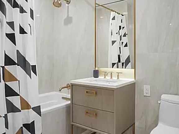 The bathroom allows you to decompress from long days out in the city with the soothing experience of a soak in an elegant tub. It offers a clean, sleek design, and glows with white marble, porcelain, and bronze.