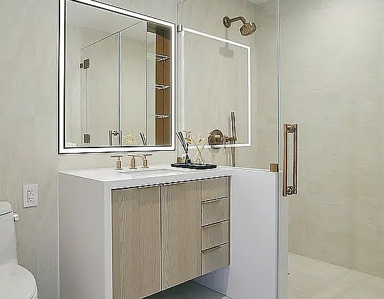 The secondary bathroom is equally luxurious. High-end finishes include grey ash veneer and an iceberg white marble vanity, complemented by a decorative wall sconce. It is equipped with elegant light bronze Kohler Purist fixtures and accessories throughout, a custom recessed medicine cabinet with bronze frame and alcove, luxurious Kohler Underscore tub, Kohler Verticyl undermount sink and Toto Eco Supreme one-piece toilet.