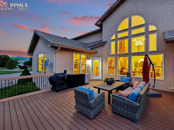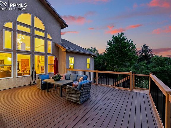 Perfectly located Gleneagle home on nearly half an acre offering tranquil privacy in the backyard and Pikes Peak view from the family room! Freshly painted and filled with natural light, this home blends modern updates with original elegance. — The main level features expansive living spaces, including a formal dining area and an open-concept great room with hardwood floors, Sky-high ceilings, custom built-ins, and a cozy gas fireplace. — The kitchen is a standout with granite countertops, stylish backsplash, a premium Thermador downdraft range hood, and Cafe induction cooktop paired with a double oven—ideal for those that love to cook. — Retreat to the main-level primary suite featuring dual walk-in closets and 5-piece bath set. A dedicated office with French doors and hardwood flooring offers the perfect work-from-home setup. — Upstairs you'll find 3 bedrooms, all with walk-in closets and built-in workspace. — The finished walkout basement features a rec room, home theater, wet bar, and even a dedicated craft room. — Additional highlights include * New Paint throughout, * New GE Premium Appliances, * New premium honeycomb blinds, * Newer windows, * 2 A/C units (2022), * Dual water heaters, * Main-level laundry with utility sink, * Gas line for BBQ, and beautifully refreshed landscaping. Located near top-rated D-20 schools, shopping, and I-25, with regular visits from local deer adding to the peaceful atmosphere, this home truly has it all — space, upgrades, views, and a layout built for everyday comfort and unforgettable entertaining. Don’t miss out… Your dream home awaits!