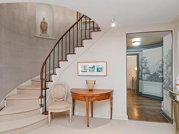 Approximately 1300 SF, this beautiful and refined home offers a gracious and flexible layout and was designed to create a townhouse-like feel with 3.5 rooms and 1.5 bathrooms. Entering the foyer, a museum like rotunda with a dome-like ceiling and exquisite Zuber wallpaper sets the tone for classic refinement found throughout the apartment. The large and sunny 26 ft long living room overlooks gorgeous townhouses on a tree-lined block. This entertainment room features original Art Deco details with high 9 ft ceilings having classic moldings and trim. A beautiful marble mantel surrounding a decorative fireplace adds a touch of coziness and charm. A stunning architectural feature in the living room is a sweeping and dramatic staircase leading to the upper level. Off the foyer is a renovated, well equipped kitchen with white cabinetry, classic quartz countertops and Bertazzoni range, microwave and dishwasher. The powder room is chic with black and white marble floors.