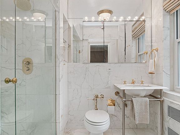 Ascending to the upper level you find a large south facing, sun bathed primary suite, approx. 21 ft long; adorned with classic panel wall moldings and a wall of fitted closets with custom built-ins. Ensuite is a beautifully renovated marble windowed bathroom with an oversized walk-in shower; fittings and fixtures are brushed gold. Also on the upper level is an open versatile den/office space and two large walk-in closets. The upper level has secondary elevator access.
