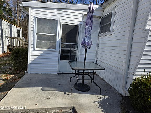 Centrally located in Brick...backs to wooded area...55+ community...mobile home...1 bedroom ..1 bath...plus attached porch ...thermal windows ..roof approx 12 years old..front patio and backyard deck..storage shed...washer and dryer ..stove and refrig included...Propane gas heat...wall unit A/C..needs some TLC...but great location and some upgrades done.