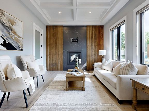 Welcome home to this stunning Executive estate! Spanning 4,926 square feet of sheer luxury, this home is meticulously handcrafted with curated, high-end materials true masterpiece nestled on a sprawling 1.75-acre lot. Enjoy unparalleled privacy and serenity.A charming circular driveway leads to the grand entrance, showcasing the home's timeless architectural style. The exterior blends robust stone, brick, and high-end materials, featuring huge windows that flood the interiors with natural light and offer breathtaking views. Inside, the grand foyer boasts soaring ceilings and elegant finishes: rich marble flooring, stunning custom millwork, and designer lighting. The open-concept main level flows seamlessly into the chef's state-of-the-art gourmet kitchen, complete with top-of-the-line appliances, a grand central island, and bespoke cabinetry. A sun-drenched, cozy breakfast area with floor-to-ceiling windows adjoins the kitchen. The main living room, a statement in comfort, features a welcoming gas fireplace and distinctive waffle ceilings. Large sliding doors open to a fantastic covered outdoor living space-perfect for sophisticated gatherings with sleek glass railings and recessed lighting. Working from home is easy in the dedicated office with custom-built-ins. For guests, the private main-floor suite is a true retreat, offering its own sitting area, a spa-like bathroom with a walk-in shower, and a huge walk-in closet. Upstairs, several spacious bedrooms each boast a private en-suite bathroom and walk-in closet, maximizing comfort and views. This home masterfully blends luxury, function, and natural beauty, creating a true oasis that awaits its new owner.
