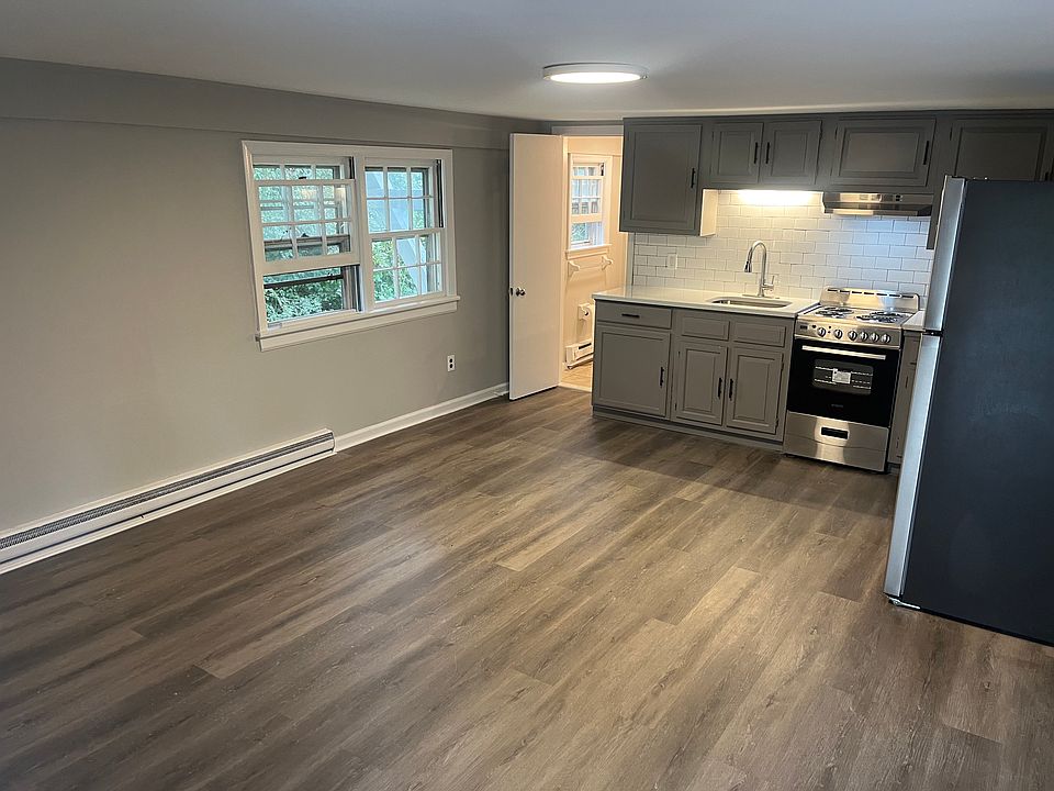 The apartment features a spacious living room, full kitchen with plenty of cabinet space, and a bright bedroom with good natural light. The unit has baseboard heating, off street parking, and stone countertops.