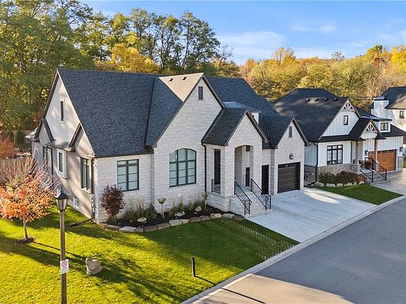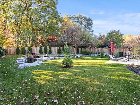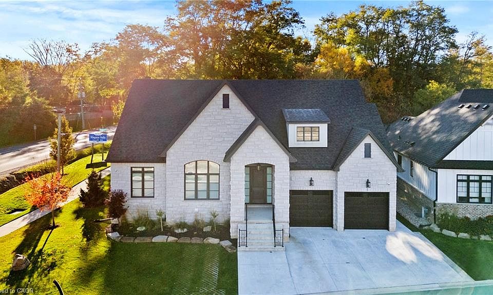 This luxury custom-built 2580 sqft bungalow offers exceptional craftsmanship, elegant design, and highly functional multi-generational living spaces throughout. Fully finished basement makes it nearly 5000 sqft finished! Designed with versatility and comfort in mind, the home features three complete kitchens each finished with custom cabinetry, quartz countertops, premium appliances (two gas ranges and one electric), three refrigerators, three dishwashers, and built-in microwaves-perfect for hosting large gatherings or offering private, independent living for extended family members. The main level showcases 12-foot coffered ceilings, engineered hardwood flooring, custom roller blinds, and beautifully appointed living areas highlighted by two gas fireplaces. For added everyday comfort, the home includes heated tile floors in three bathrooms and the lower-level kitchen. A self-contained 1-bedroom granny suite with its own entrance and dedicated parking provides privacy and flexibility, while the fully finished lower level includes two additional bedrooms, a full bathroom, a walk-out, and a spacious walk-in fruit cellar. The property features two full laundry rooms, each equipped with washer, dryer, laundry tub, and storage. Additional upgrades include Russound integrated sound and satellite wiring, a full security camera and alarm system with monitoring option, and an in-ground sprinkler system for effortless exterior upkeep. The home is fully fenced, professionally landscaped with thoughtful rock and garden design, and includes a covered outdoor porch to enjoy peaceful surroundings in every season. Every detail - from cabinetry to ceiling design to layout functionality - reflects the care put into creating a home that is both luxurious and deeply livable. This is a rare offering that combines elevated finishes, spacious design, and true multi-use living under one roof, providing comfort, privacy, and long-term value for its next owner.