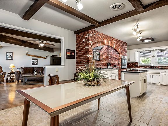 Welcome to this delightful ranch-style home, where stone accents & a pergola-covered entry create an inviting first impression as you arrive via the long private driveway. Inside, a stunning natural stone fireplace anchors the living space, complemented by rustic wood beams that add warmth & character thruout. Spacious kitchen - a chef’s dream, boasts a unique brick accent wall surrounding a 5-burner gas cooktop, with ample counter space & storage. Large windows bathe the home in natural light, enhancing the open, airy feel. Currently used as a third bedroom, the cozy den includes a built-in Murphy bed, a huge closet, & custom shelving—offering great flexibility for guests or home office use. Outside enjoy views of Kingswood golf course above the scenic "Danger Will Robinson" trail. In spring, the yard comes alive with mature trees, shrubs, & colorful perennials blooming in thoughtfully maintained flower beds. Recent updates: Water Heater '24, HVAC '24, Roof '18. On a 2-bedroom septic system.
