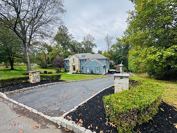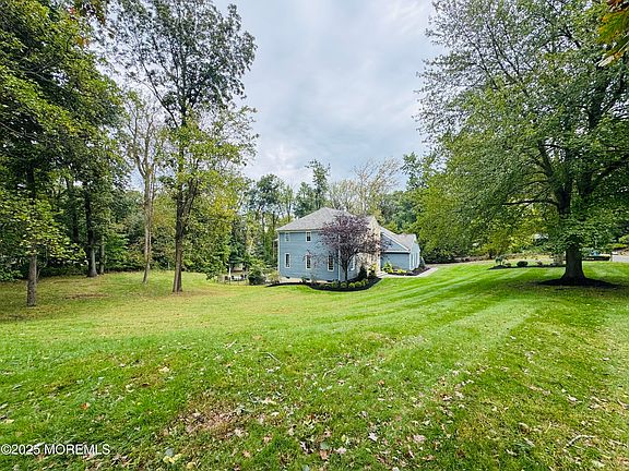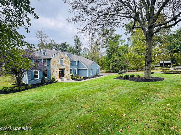 Perfectly located on a quiet cul-de-sac backing to scenic Holmdel Park, this exceptional home combines privacy, comfort, and convenience. Set on a large corner lot, it's just minutes from Route 34, the Parkway, and NYC transit. Inside, over 4,000 sq ft of light-filled space welcomes you with a grand foyer and curved staircase leading to a sunken living room with 10-ft ceilings and French doors to a private study. The family room impresses with a 20-ft vaulted ceiling and floor-to-ceiling stone fireplace. A formal dining room with tray ceiling and a spacious eat-in kitchen with premium appliances, double wall ovens, and trex deck access complete the main level. Dual staircases provide access to both the upper level and finished walkout basement, which adds 2,100+ sq ft, a full bath, and direct pool and patio access. Upstairs features a luxurious primary suite with walk-in closet and bath, plus three hardwood bedrooms. This prime park-side location is Holmdel living at its very best!