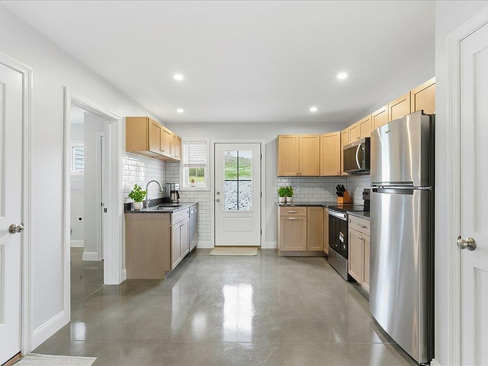 Welcome to these thoughtfully designed 2-bedroom, 1-bathroom condos in Auburn, Maine, offering 826 sq. ft. of modern, low-maintenance living. Each unit comes with a one-car garage and private patio, providing the perfect balance of comfort and convenience. Inside, you'll find a stylish kitchen with wood cabinetry, leathered granite countertops, and stainless steel appliances, while polished concrete floors flow seamlessly throughout the open living spaces. The full bathroom features a walk-in shower and washer/dryer hookups for added convenience.