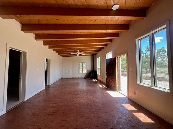 Holiday Gift to Self on this Price Reduction. This truly open concept, sun streaming 2 bed 2 bath home is utterly charming with high beamed ceiling and brick floors that'll keep your temperature perfect. Efficient kitchen with new eat-at counters that leads to attached garage with laundry area and extra storage with new garage door opener. Bedrooms installed with new wood lam and double closets. Owner's suite has fully remodeled bathroom with oversized shower. Quiet street on nearly 1 1/4 acres with added storage in garage and a large separate storage shed that can work as workshop amongst the front treed courtyard inviting gardens and imagination.