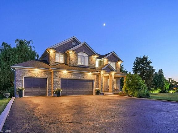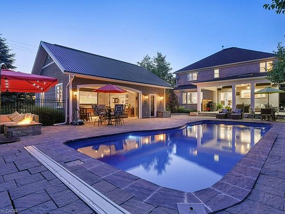 Experience the perfect blend of elegance & comfort in this beautiful estate, situated in the sought-after community of West Montrose. Designed with both style and function in mind, this home offers a thoughtfully planned layout creating an ideal setting for families of all sizes to enjoy. Main floor Captivates you with rich engineered hardwood flooring & premium ceramic tile throughout. At the heart of the home lies a true chef’s kitchen, featuring high-end appliances, granite countertops, undermount sink, & a professional 6-burner gas stove. The kitchen also includes two dishwashers, soft-close cabinetry, a built-in fridge, & two expansive islands, perfectly suited for everything from intimate family dinners to grand-scale gatherings. The five generously proportioned bedrooms each offer a private/semi-private bathroom. Large primary suite serves as a tranquil retreat, featuring a 4-piece ensuite & walk-in closet. Luxury upper level laundry room is located on this level. Step outside to a spectacular covered back porch complete with a wood-burning fireplace, built-in overhead speakers, heaters, & skylights. Stunning inground saltwater heated pool, creating a private oasis perfect for entertaining. Beyond the pool, a beautifully designed pool house offering a stylish space to enjoy. Complete with a full kitchen, a sit-up breakfast bar, a projection screen for movie nights, & a 2-piece bath & shower facilities. Landscaped gardens & mature trees create a picturesque retreat like setting. The fully finished lower level offers two bedrooms, 3pc bath, office space/play areas, & a large rec room. The home boasts a triple car garage, offering ample space for parking & storage. The enormous driveway provides parking for up to 16 cars. And don’t forget, this home is equipped with surround sound & total home audio, provided by "Station Earth", enhancing every room with exceptional sound. This is an extraordinary opportunity to make this one-of-a-kind property your own.