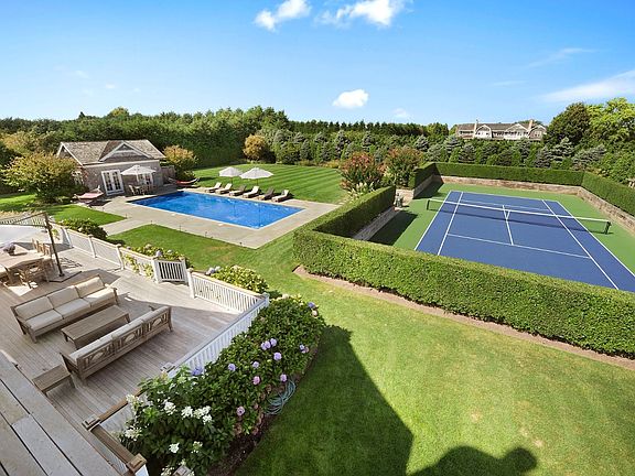 Classic shingled home with oversized pool and tennis on 1.4 acres in Southampton Village bordering Water Mill. The home features seven bedrooms, eight full bathrooms, and two half bathrooms. Dramatic double height foyer, open floor plan, a kitchen opening out to Brazilian teak decks, living room, family room, formal dining room, and a large en-suite guest bedroom. Upstairs are five vaulted ceilinged bedrooms, including the spacious master suite with its own sitting room/office and balcony overlooking the spectacular grounds. Lower level has a home theater, billiard room plus a gym with sauna and another bedroom. Very south, ocean breezes, farm field views, gated, sunken tennis, 20 by 50 pool, pool house with kitchenette. Immaculate home. A true Hamptons experience awaits. JULY 2 THRU JULY 10