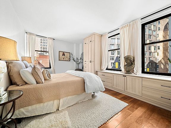 The expansive living room showcases extra-large windows that flood the space with natural light, complemented by custom built-ins and premium light filtering roller shades. The generously sized primary bedroom easily accommodates king sized furniture and features custom built-ins, plus enjoys dual exposures with windows to the north and west for ample natural light. The second bedroom is also perfectly positioned and spacious. Both bedrooms include premium blackout roller shades for optimal rest. The cherry on top is the dedicated home office space, expertly designed for flexibility, fashion, and function - perfect for today's work-from-home lifestyle.
