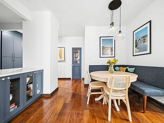 The meticulously renovated gourmet kitchen features a GE Cafe French door refrigerator with water dispenser and ice maker, GE Cafe 6-burner gas range with range hood, Bosch 800 dishwasher, and St. Martin hardwood custom cabinetry with built-in spice rack, Lazy Susan, and pullout trash compartments. The custom storage solutions continue throughout the kitchen, maximizing every inch of space. Gorgeous Calacatta Nuvo Quartz countertops round out this impeccable renovation. The kitchen opens up to a charming banquette dining area, creating the perfect spot for intimate breakfasts or entertaining guests.