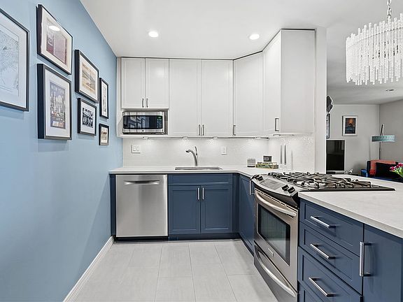 Upon entering, you’re greeted by a welcoming foyer nook and a spacious walk-in closet. Further is the open, eat-in kitchen that is thoughtfully designed with navy and white custom cabinetry, sleek stainless-steel appliances, and white Caesarstone countertops — the perfect balance of style and function for both everyday cooking and casual entertaining. The king-sized bedroom offers a true retreat with a full wall of closets, plenty of room for a home office and reading nook, as well as sweeping water views to enjoy from the comfort of your own space. The oversized, renovated bathroom features a modern vanity, a glass-enclosed rain shower, and an additional dressing/vanity area with generous storage. Additional apartment highlights include recessed lighting throughout, rich cherry hardwood floors, and the convenience of common storage space just one floor down (18th floor).