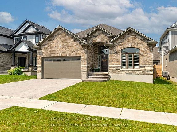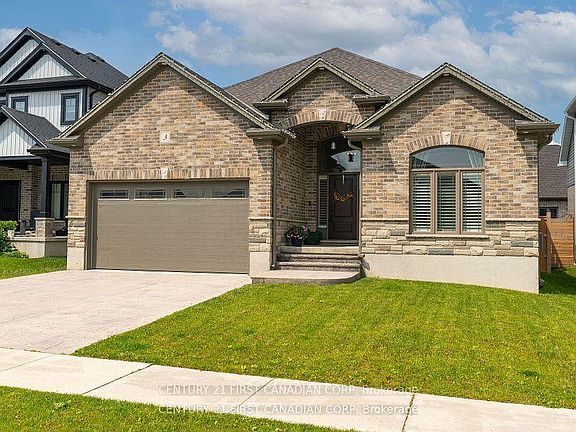 Welcome to 3 Hardy Court, a former model home located on a premier street in Lucan's sought-after Ridge Crossing neighbourhood. This stunning 1,732 sq ft full-brick bungalow looks straight out of a designer magazine and is sure to impress! Built in 2019 and in impeccable condition, this home is better than new no construction zones, just turn-key perfection. The rare and spacious 3-bedroom main floor layout offers the convenience of one-level living without sacrificing square footage or style.From the moment you arrive, the curb appeal is evident with a stamped concrete driveway and a 16-foot stamped concrete patio that spans the width of the home in the fully fenced backyard perfect for entertaining or quiet evenings. Inside, the home welcomes you with an extra-wide foyer and a dramatic 12-foot vaulted ceiling, leading to a grand great room highlighted by a cozy gas fireplace and tray ceiling with crown molding. The kitchen is sleek and modern with ceiling-height cabinetry, quartz countertops, beautiful white subway tile backsplash, a massive island with seating for four, a stylish range hood, KitchenAid appliances, and a large walk-in pantry. The open-concept dining area with California shutters flows seamlessly to the outdoor living space.The primary suite is tucked away in its own private wing, offering a peaceful retreat with a walk-in closet, and a spa-inspired ensuite with double vanity, quartz countertops, and a glass walk-in shower. Two additional generously sized bedrooms are located at the front of the home, sharing a stylish 4-piece bath. A well-located main floor laundry room with custom built in cubbies, connects conveniently to the double-car garage.Situated just steps from schools, walking trails, the community centre, and a short drive to North London, this is Lucan living at its finest. Whether you're upsizing, downsizing, or right-sizing this pristine, feature-rich home is a must-see.