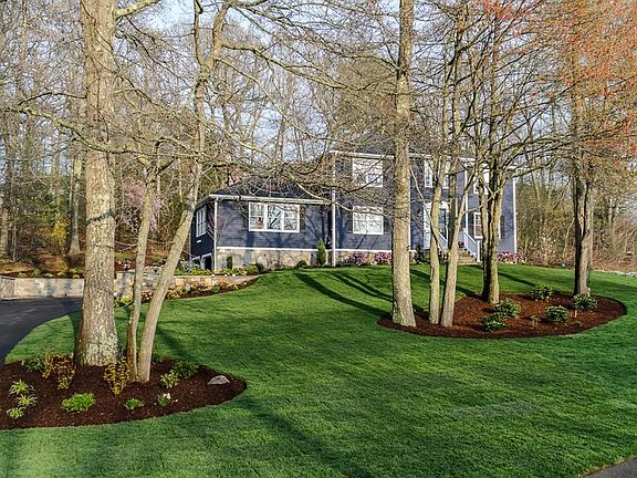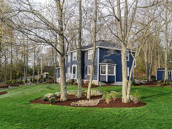 Beautifully maintained and newly-renovated, 2,800 sf hip-roofed Colonial on 1-acre private lot in highly desired Dudley Hill Estates. Recent updates include new and expanded kitchen; new hardwood flooring, bathrooms, paint, baseboards and carpets upstairs; and a new gym in the partially finished basement. This gorgeous home also recently had extensive custom masonry work on the exterior with new stone walls and foundation facing installed, a fire pit, an entirely new landscaping package, and a freshly paved driveway. The roof and gutters are also brand new. The first floor boasts a huge updated and expanded cherry kitchen with Tuscan-inspired tile with radiant floor heating. Storage space abounds, with two large islands, pantry, stainless steel high-end appliances, sky lights, and eat-in nook. The kitchen is immediately adjacent to a large and cozy family room with Jøtul wood-burning stove, vaulted ceilings, wainscoted feature wall, and a custom-built bar. The kitchen also opens onto an Azek deck which cascades down to a private, stone wall-encircled brick paver patio with a built-in space for a BBQ grill. The first floor also features a formal dining room and living room with hardwood flooring throughout, a ½ bath, and a bonus room with first-floor laundry. The newly renovated 2nd-floor has four bedrooms and two baths. The master features a walk-in closet, brand-new gleaming hickory, hand-scraped hardwood floors, and a brand new master-bath with new tile throughout, tiled shower, skylight, and a dual-sink marble-topped vanity. The partially finished lower-level level offers 450 sf of additional space with a mud room and brand-new gym. The unfinished portion houses utilities, a work bench and tons of additional storage space. A two-car garage is housed beneath the family room. This home is conveniently located near major routes, outstanding schools, commuter rail stations and is equidistant to all that Boston and Providence have to offer!