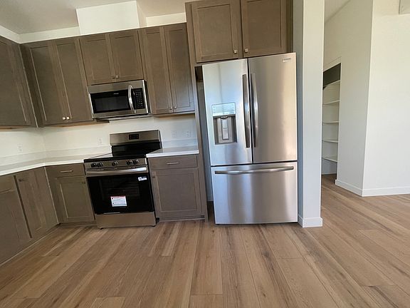 The kitchens are thoughtfully designed for both beauty and function, featuring matching stainless steel Frigidaire appliances, Della Terra quartz countertops, American Woodmark cabinetry, and stylish fixtures by Harney and Delta. These well-equipped kitchens bring style and ease to everyday living.