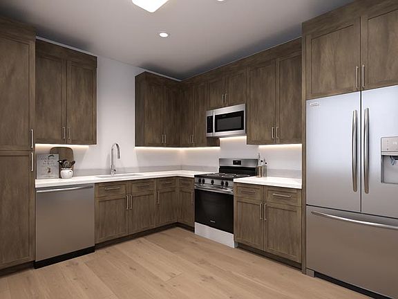 The kitchens are thoughtfully designed for both beauty and function, featuring matching stainless steel Frigidaire appliances, Della Terra quartz countertops, American Woodmark cabinetry, and stylish fixtures by Harney and Delta. These well-equipped kitchens bring style and ease to everyday living.