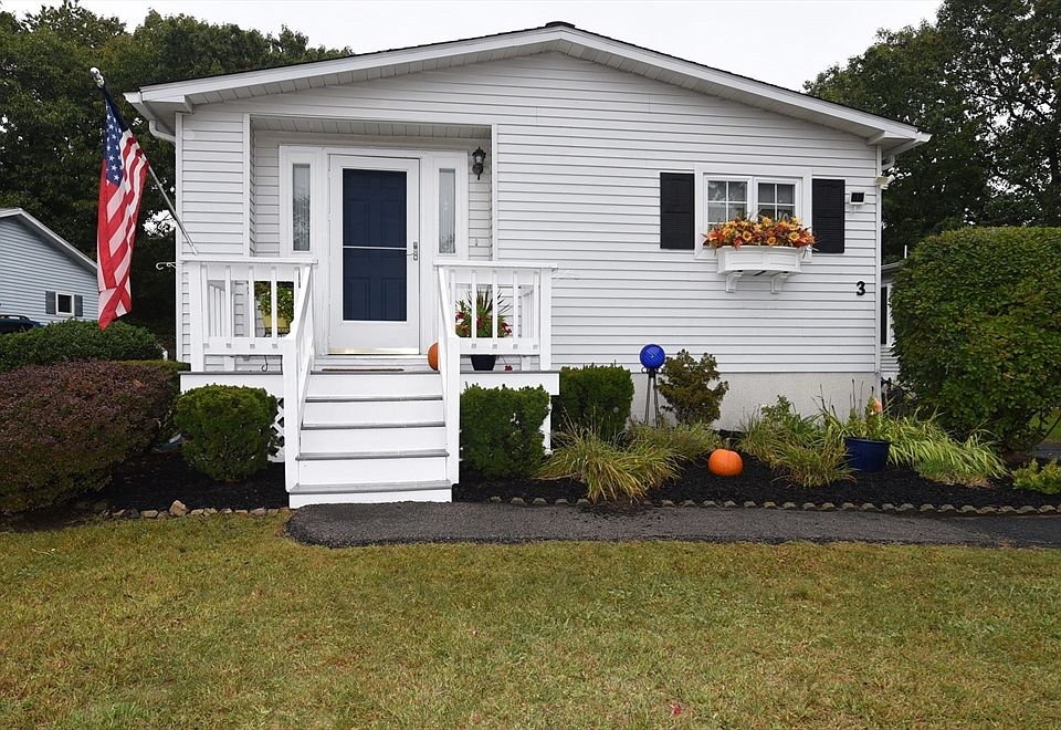 Welcome to Leisurewoods! Move right in to this beautifully maintained 2 bedroom 2 bath ranch-style home nestled on a lovely cul-de-sac. Features include open floor plan, cathedral ceilings, sun-filled eat-in kitchen. Primary bedroom boasts 2 generously sized closets and private en-suite bath. Second bedroom serves as guest quarters or office. Central air, newer laminate flooring, 2 skylights that supply plenty of natural light, upgraded electrical panel, maintenance-free vinyl siding. Washer and dryer included. Side deck for outdoor entertaining. Shed offers additional storage space. LEISUREWOODS is an active 55+ community, professionally managed and jam-packed with amenities. Monthly land lease fee includes curbside trash pick-up, use of clubhouse, billiards, library, heated swimming pool, bocceball court, fire pit, courtesy van and more. Close to shoppes, hospital, senior center, and highway, this home provides the perfect blend of comfort, convenience and easy living. Welcome Home!