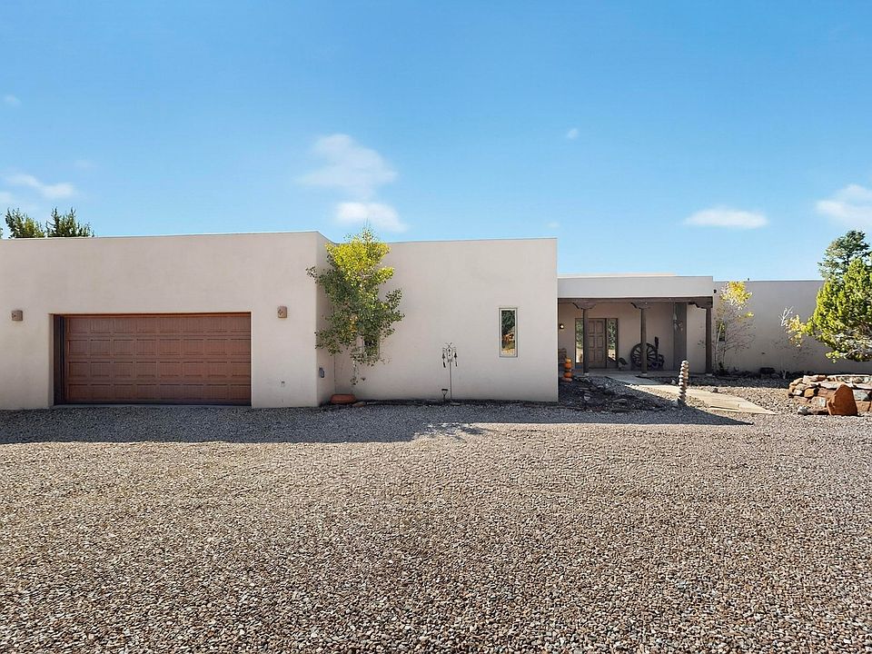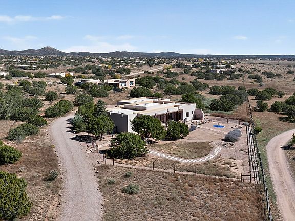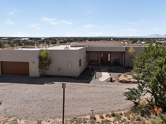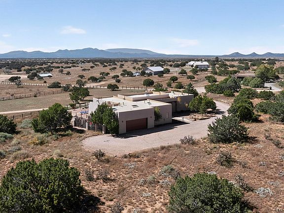 Custom designed and built spacious single level, open plan, split bedroom design in Eldorado bordering Los Caballos. Privacy and fabulous mountain and sunset views from home and portals. There are two unique back to back fireplaces, one in each room, a dramatic Chaco style stone facing in the family room and a traditional kiva in the family room/study. The private owners suite features two separate 3/4 bath rooms, one with a tub and the other with a walk in sharable shower, plus 2 walk in closets. The laundry room is close by off the hall. The large kitchen includes a breakfast bar and cosy breakfast nook which accesses the south portal and gardens, plus there is an extra half bath for guests. There is a formal dining area with access to a private walled garden and patio. Both guest bedrooms are a good size and share a full bath between them. The oversized 2 car finished garage has plenty of guest parking. Incredible expansive night skies from spacious fenced gardens it is centered on 1 1/2 acres on the south central border of Eldorado. Easy access to all the Eldorado amenities, local shopping centers and only minutes into Santa Fe.