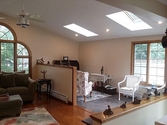The minute you enter this lovely family home you will be amazed. From the entry farmers porch you step into the sunfilled 26 x 18' - 5 year young Great room accented by gorgeous hardwood floors, office nook, Skylights, Bay windows,&, atrium doors which leads to a nicely sized deck perfect for entertaining. Well designed open floorplan is perfect for family gatherings -every one can be part of the festivities.Close attention to details were addressed in the planning & design of the large country kitchen accented with lovely light cherry cabinets, custom designed breakfast bar and informal dining area.you will enjoy Sitting before the gas log fireplace in the spacious formal dining room with beamed ceiling, hardwood floors and bay window. Hardwood floors run through 1st floor. The lower level has a large front to to back playroom, freshly painted walls, new windows, recent gas boiler and updated electric circuit breakers. Plush landscaping. Fenced yard & ... hurry.Minutes to UMASS.