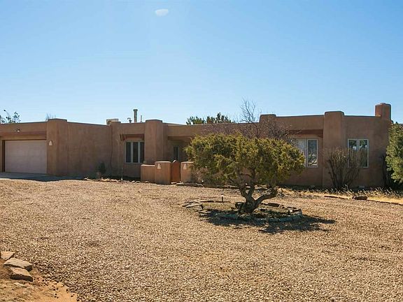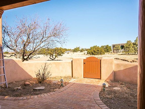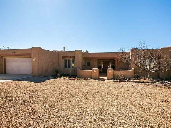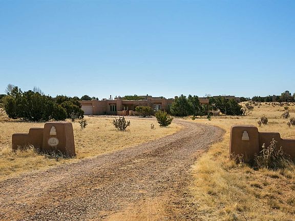 Beautiful Kim Dressel custom home! Large single story on 1.75 acres. Lovely front courtyard entrance with brick walkway leading to the front portal with exposed beams & vigas. At the foyer you'll begin to see the fine detail of this home. Saltillo flooring, art niches, exposed beams & vigas throughout. 3 amazing fireplaces for cozy comfort. The great room offers superb sunsets and boasts a huge custom fireplace with hand carved mantel. The kitchen is large with lovely tile counter tops, big island, loads of cabinets another fireplace in the nook, stainless steel appliances, and a built in desk. Imagine cooking and entertaining here! 10 skylights for natural light. The owner's suite is private and has another beautiful kiva fireplace, full bath and large walk in closet. 3 more bedrooms on the other side. The home sits back nicely from the road and offers a monument entrance and nice curved driveway. The south and west portals are all brick with more exposed beams and vigas. Enjoy the views! Radiant heat and split mini systems for your comfort.
