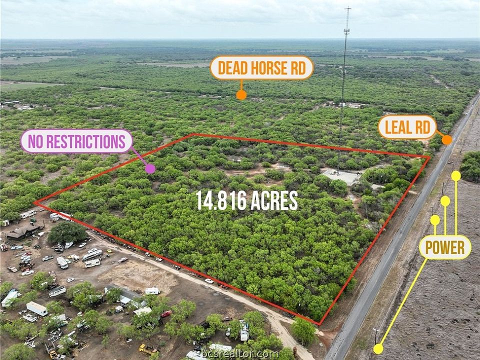 Almost 15 acres about an hour south of San Antonio, just off I-37. Fenced three sides. Cell tower on site. No income from cell tower. Residential or commercial, unrestricted. Survey available.