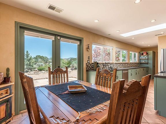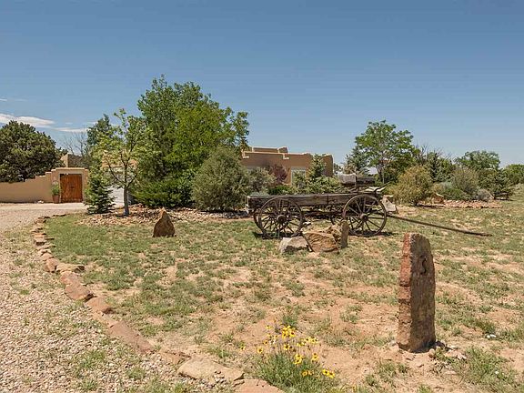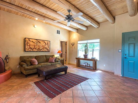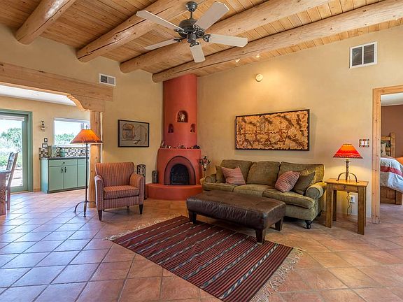Wonderfully remodeled home, plus detached office/studio space. Vigas, Kiva fireplace, tile flooring throughout, plus Central Air Conditioning. Good bedroom separation. Great kitchen w/ NEW stainless appliances. Beautiful walled courtyard, Gazebo, fountain and flagstone plus great mountain views.