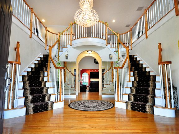 Welcome to your dream home! This custom-built Colonial offers seven bedrooms, 5.5 baths, and over 7,000 sq ft of beautifully finished living space. The grand two-story foyer with a split staircase opens to a stunning family room featuring a 19-foot cathedral ceiling and a gas fireplace. The gourmet kitchen is a chef's delight, featuring granite countertops, Viking stainless-steel appliances, custom tilework, and cherry oak cabinetry. A formal dining room with 9-foot ceilings, crown molding, and French doors provides an elegant setting for entertaining. The first-floor primary suite includes walk-in closets and a luxurious bath with a stall shower. A second spacious primary suite on the upper level offers additional comfort and privacy. The upper floor also features four further bedrooms and three full baths, providing ample space for family and guests. Gleaming hardwood floors, detailed millwork, and abundant natural light flow throughout. Perfect for both grand gatherings and everyday living, this exceptional home combines style, comfort, and quality craftsmanship.