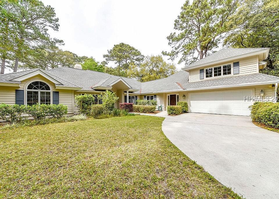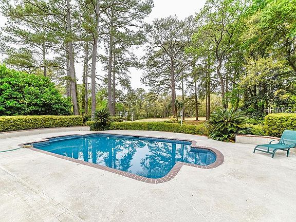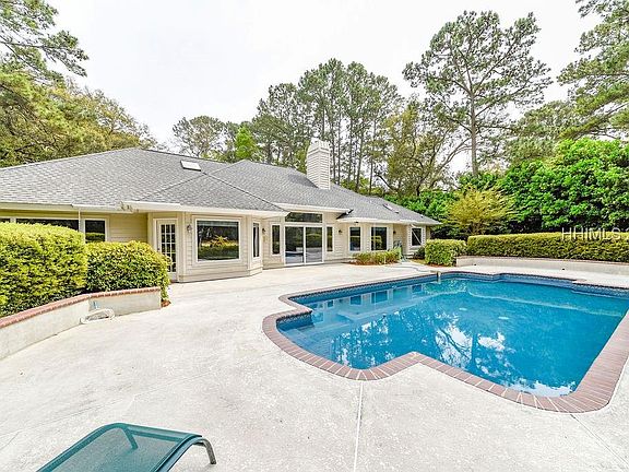 Fabulous family home on fairway & lagoon in Spanish Wells. 5 bedrooms, 4 full baths on first floor. Very private and secluded pool with great views of the 8th hole and lagoon. Large master suite, family room, fireplace, lots of closets, smooth ceilings, circular driveway with 2 car garage. Beautifully landscaped yard with excellent privacy on a full 1.0 acre site. All appliances, extra refrigerator and gas range top included. Storage shed not included in sale.