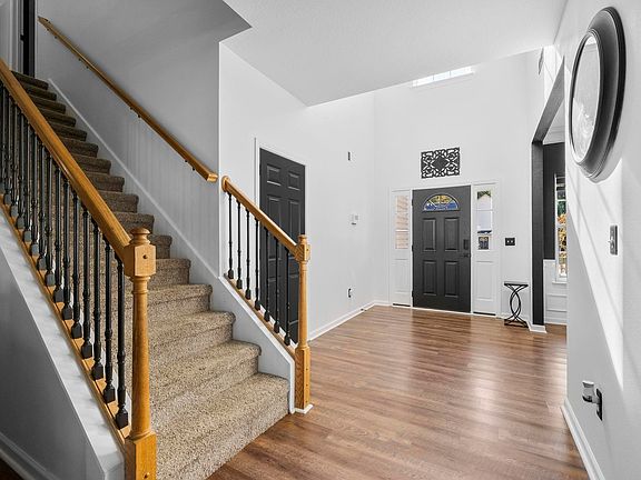 Newly updated flooringModern black-and-white paletteSoaring two-story foyerDramatic feature wallUpdated pendant lightingWarm wood cabinetryBlack granite countertops
