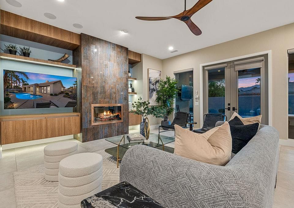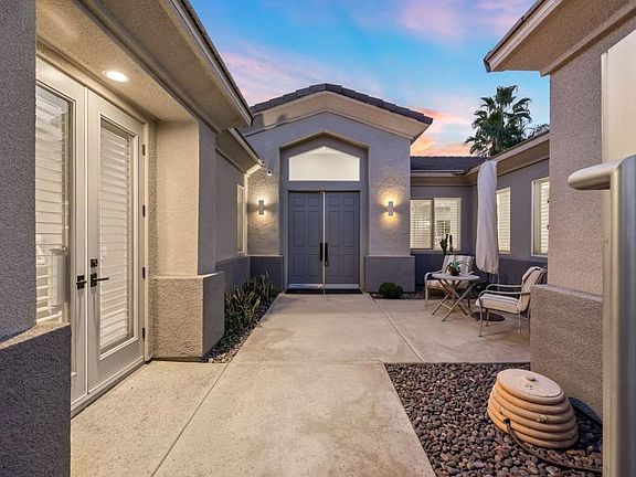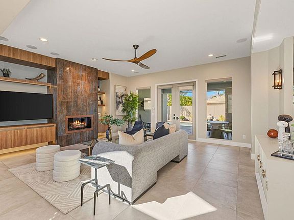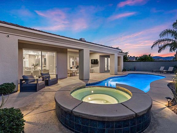 Nestled in a quiet cul-de-sac within the Versailles gated community, this beautifully remodeled home is ready for its next lucky owner. Designed as a ''forever home,'' it boasts an array of luxurious upgrades and thoughtful custom details and is also in the IID district for electricity! Upon entry, you're welcomed by a gated courtyard with a custom gate and double-door entry, leading into an open, airy space. The family room features an updated reimagined fireplace with built-in custom cabinetry. Also, take note of the wood shutters and custom paint. Every detail has been carefully curated with upgrades throughout, from the gorgeous tiled flooring to the completely remodeled kitchen, designed to seamlessly look out to the living room for effortless entertaining. The kitchen is equipped with newer, high-end appliances and features a widened nook entry that opens to the dining area--perfect for hosting guests. Two bathrooms have been thoughtfully remodeled, and in the primary bedroom there is a custom wardrobe with built-in lighting. Outside, the private, low-maintenance backyard offers western mountain views. Enjoy the perfect desert evenings with a covered rear patio, saltwater pool, spill-over spa with smart controls, and newly installed turf (2024). The smart home features include a Nest thermostat, myQ garage opener, Control4 audio, some automated blinds, and a professionally stacked AV closet for surround sound and camera equipment. This home is not only stunning but offers an array of smart tech upgrades that will enhance your living experience. The community of Versailles is known for its amenities, including tennis courts, a half-court basketball court, sidewalks throughout, and a low HOA fee. Don't miss your chance to own this exceptional property in one of the most sought-after communities. Schedule your private tour today!