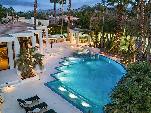 Designed by celebrated architect Narendra Patel, protege of the legendary Donald Wexler, and reimagined through an uncompromising $2.5M renovation, this extraordinary 2.4+ acre modern estate in Rancho Mirage's exclusive Clancy Lane enclave stands as a true work of art. Positioned on two expansive lots with room to further increase square footage, this compound offers unmatched privacy, architectural pedigree, and future potential. Encompassing approximately 8,800 sq. ft., the estate includes a dramatic main residence and two detached guest houses, offering seven bedrooms and nine baths across the property. Every inch of the renovation was executed with precision: new travertine flooring, state-of-the-art HVAC systems, custom lighting, high-efficiency doors and windows, and a comprehensive 24-camera security network elevate this estate to a modern standard of luxury. Interior spaces are defined by grand vaulted ceilings, sweeping volumes, and walls of glass that dissolve the boundaries between indoors and out. The great room, where Sonny Bono famously received President Gerald Ford's endorsement, features a sculptural fireplace and sophisticated wet bar. The sunlit chef's kitchen offers professional-grade appliances, dual islands, and generous prep and entertaining space. Steeped in legacy, this estate has hosted U.S. Presidents, global dignitaries, and iconic entertainers, yet remains warm, livable, and deeply inviting. The resort grounds rival five-star destinations. A newly envisioned zero-edge infinity pool, wrapped in Turkish white limestone, anchors the outdoor experience. Nearby, an 18-seat sunken Hibachi bar and a spectacular 450 sq. ft. outdoor kitchen complete with Forno Piombo wood-fired pizza oven, smoker, fryer, refrigeration, and custom storage create an unrivaled culinary and entertaining hub. Additional amenities include a professional tennis court, tranquil koi ponds, lush mature landscaping, and a hidden 5,000-bottle wine cellar with a private dining room, one of the desert's most remarkable treasures. Less than five minutes from El Paseo's luxury boutiques including Louis Vuitton, Tiffany & Co., Gucci, Bottega Veneta, and Apple, as well as the desert's premier dining, this property blends architectural brilliance with an incomparable lifestyle. A rare sanctuary of modern luxury, storied history, and resort-level amenities, this estate is one of Clancy Lane's most significant offerings, an iconic retreat destined for a discerning buyer seeking pedigree, privacy, and possibility.