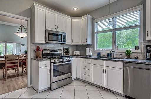 Presenting a beautiful & rare unit at coveted Huckins Farm! Nearly impossible to find a stand-alone, 3 BR unit w/attached garage & full WALK OUT basement, but we have it! The home looks over a rolling field, so natural light floods this open & airy unit. The kitchen has been recently updated & features stylish white cabinetry, a subway tile backsplash, stainless steel appliances & granite counters. Open floor plan w/a combined dining/living area is perfect to entertain friends & family or to simply relax in the evening by the cozy marble fireplace. In warmer weather, you can spend evenings on the screened-in porch or unwind on the sunny deck, both are great spots to take in the scenery and watch the deer or occasional horse come through the field. Enjoy easy living with the desirable 1st floor master suite with walk-in closet, a jetted tub, glass shower, decorative tile and vanity. Upper level features 2 BRs, a loft & full bath.1st floor laundry, tons of storage & walkout lower level!