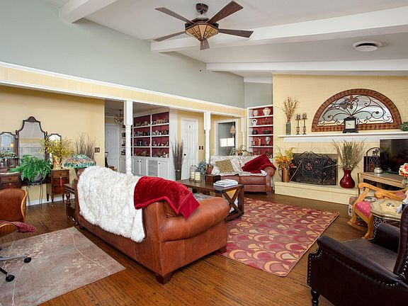 The formal dining area enhances the charm of a large den featuring a vaulted ceiling and cozy fireplace, creating a warm and inviting atmosphere. The expansive kitchen and breakfast area, highlighted by a lovely bay window, are perfect for entertaining and family gatherings.