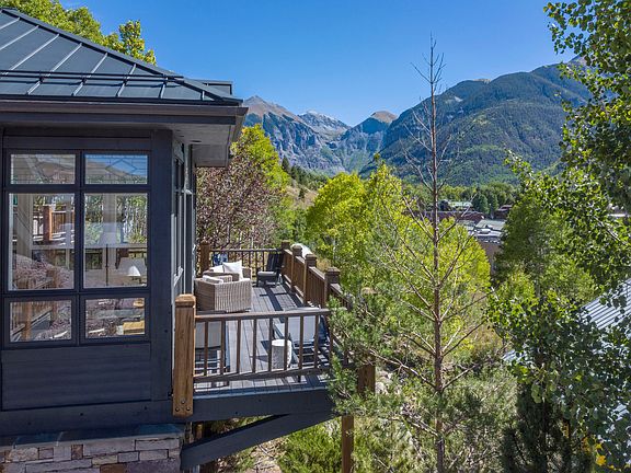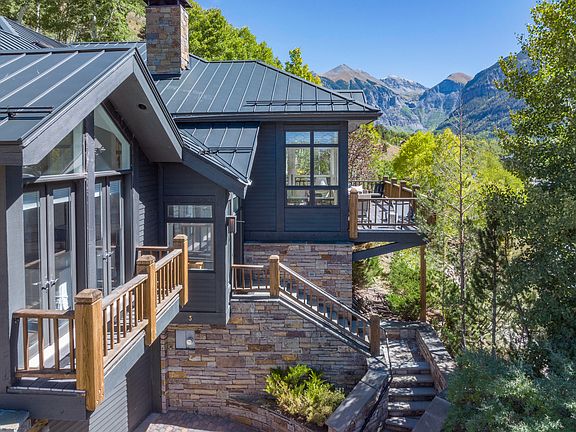 With panoramic unobstructed views, this property sits on the edge of town, offering the best of both worlds - total privacy & walking distance to downtown Telluride. Grand, open plan layout offers light filled interiors, vaulted ceilings and majestic views of the Mountains. Plentiful indoor and outdoor gathering space. Sun-drenched decks & spacious rear lawn, all fully fenced and private. Primary suite takes up entire top floor, with large walk-in closet & ensuite bath. Guest Bedrooms located on lower level, with private ensuite bathrooms. Bunk Room & Flex Office/Guest Room offer great overflow space. A wonderful family home! An entirely new driveway and front stair heating system, with all new pavers and stone, has been installed. Summer Video Link: https://www.dropbox.com/scl/fi/s8w7vbxawi0hkoab6u4li/OB3.mov?rlkey=0snqgnmizezi5955n82k3rhly&st=h1d1ytni&dl=0