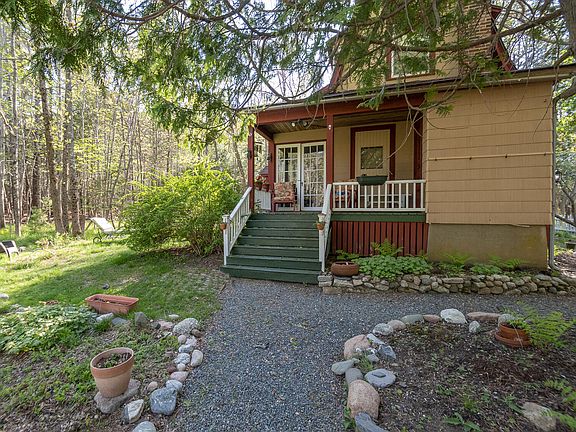 The house sits along a small brook surrounded by a host of perennials and trees that provide flowering color throughout the summer.