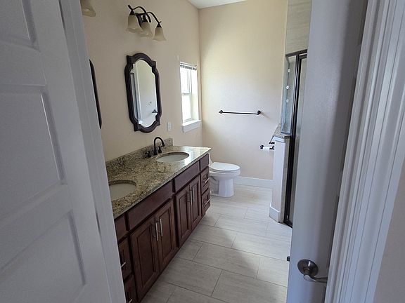 The spacious master suite offers a walk-in closet, dual sinks, and a walk-in shower. The split bedroom layout provides added privacy, with the second bath featuring a relaxing Jacuzzi tub.