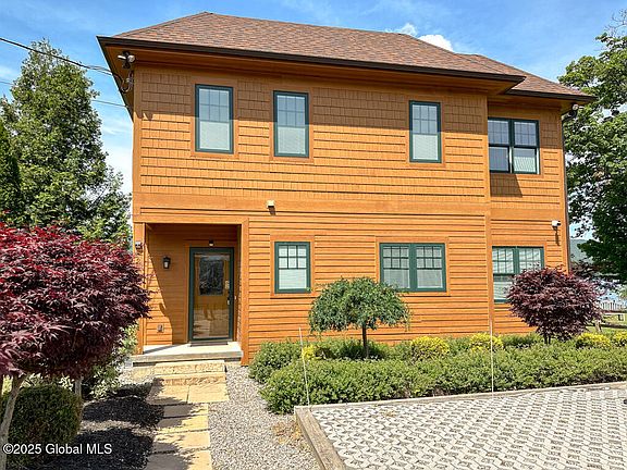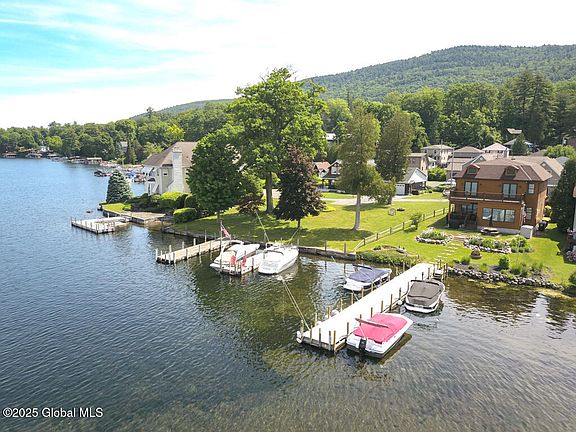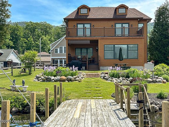 LAKE GEORGE LAKE HOUSE with 75' dock! Great & Convenient location. This 4 bedroom 2.5 bath lake home has so many desirable features. Incredible kitchen with custom cabinets, a large island and dining area. Spacious open living room, with gas fireplace. The second Floor has 4 bedrooms, two of the bedrooms face the lake and have access to a full length of the house balcony/deck for panoramic views. The primary bedroom has California Closets and a private full bathroom. The 65' of lake frontage has a 75ft dock that can accommodate 4 boats. Parking for three vehicles. Beautifully landscaped lot. Covered back porch facing the lake. Basement partially finished for added storage and/or living space. Whole house generator. Walking distance to the Village for entertainment and dining.