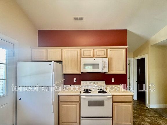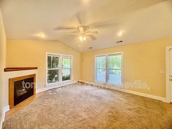Welcome to this charming 2-bedroom, 2-bathroom single-family home located in the beautiful Asheville, NC area. Nestled in a cul-de-sac within Buncombe County, this home offers a blend of comfort and convenience. The house features a spacious eat-in kitchen equipped with an electric range, refrigerator, dishwasher, and microwave. The home boasts vaulted ceilings, a gas log fireplace, and ceiling fans throughout, creating a cozy and inviting atmosphere. Each bedroom is carpeted and includes walk-in closets. With vinyl flooring in high-traffic areas, this home is designed for easy maintenance. Washer and dryer are included for your convenience. Step outside to a covered front porch, perfect for enjoying the outdoors. The property also includes a fenced backyard, providing a private space for outdoor activities. A 2 car car garage is available for parking. Experience the perfect blend of comfort and convenience in this Asheville home.