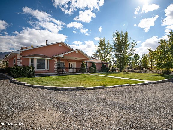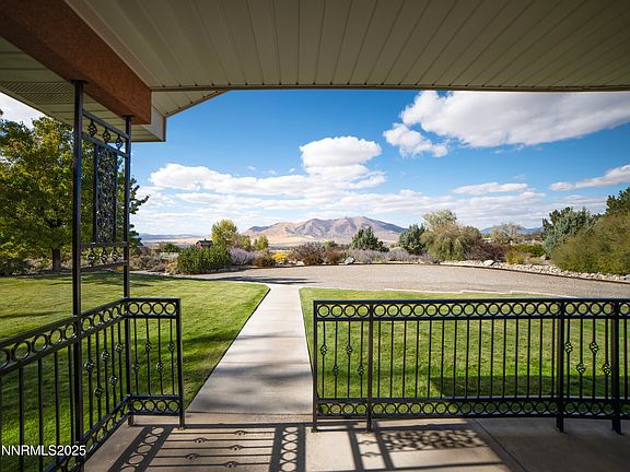 Stunning Custom Executive Home on 5.81 Acres with Breathtaking Views! Welcome to your private retreat! This beautifully designed executive home offers a spacious open floor plan with vaulted ceilings, gorgeous hardwood flooring, and breathtaking panoramic views. The living area features a cozy wood-burning fireplace, perfect for chilly evenings. The chef's kitchen is a true centerpiece, boasting granite countertops, a large island, breakfast bar, and custom ceramic tile flooring that flows seamlessly into the dining room—perfect for entertaining guests. The luxurious master suite is thoughtfully separated from the other bedrooms for maximum privacy. It includes a stunning alcove window, double sinks, two showers—including a steam shower, a relaxing bathtub, and a spacious walk-in closet. On the opposite end of the home, you'll find four additional bedrooms, each featuring walk-in closets. There are three additional bathrooms, ideal for guests or family plus a bonus room that could be used as an office, family room, etc. Step outside to enjoy your morning coffee on the covered front or back patio, taking in the gorgeous Nevada sunrises/sunsets and the beautiful mature landscaping. The property also features a large shop, huge concrete pad, nice circle driveway for easy trailer access, dog run, and more. Tucked away on a private road, this 5.81 acre property offers peace, privacy, and the space to truly unwind, yet is close enough to town for convenience.