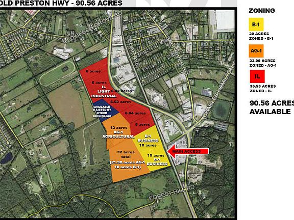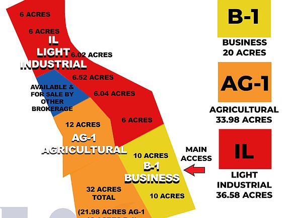 This property is also part of a larger development opportunity that includes a total of 90+ acres zoned B-1 (business), A-1 (agricultural) and IL – (Light Industrial) which may all be purchased as well. This property is located approx. 1 mile from the interstate. For more details please see photos and contact us for additional information.