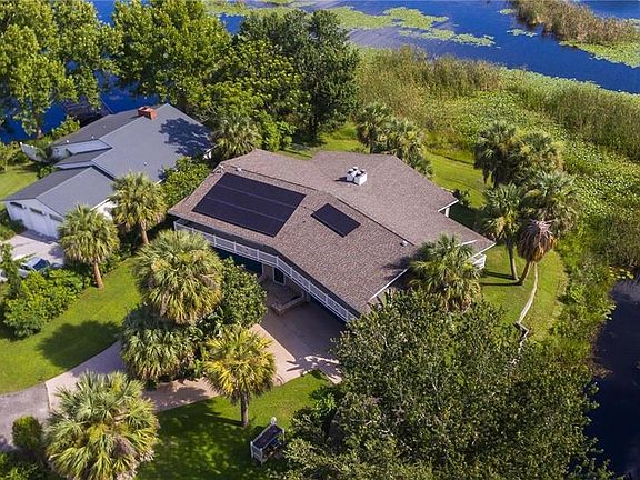 Lake Weir estate with over 150 feet of water frontage directly across from the Carney Island Nature Preserve! This home comes fully furnished with brand new hand-picked furniture and televisions. Interior details include cathedral ceilings throughout living areas and master bedroom, whole house water softener system, 3 compass inlays, and 2 wood burning fireplaces. The second floor includes the main living areas and 4 bedrooms, including the primary suite. The kitchen has a professional gas range, stainless steel appliances, ample cabinet and pantry space with custom built-ins and a bay window overlooking the lake. The grand living room and kitchen boast high ceilings with exposed beams and large picture windows for panoramic views of the lake and nature and wildlife preserve. Off the living area is the office, which has French doors to the front balcony that wraps around the home on both sides. The spacious primary suite features a wall of picture windows with breathtaking water views, and sliding glass doors to a balcony overlooking the lake. It also offers a custom walk-in closet, sitting area, wood-burning fireplace, and an ensuite bathroom with Jacuzzi tub. The ground floor features an oversized bedroom/bonus room, a full bathroom, and an insulated theatre room with five raised stadium recliners. Exterior features include a large screened-in porch with an outdoor kitchen, a detached shed with power, and solar panels. Views and backyard privacy are protected by the neighboring nature preserve across the water. This waterfront retreat sits at the end of the cul-de-sac and the double driveway leads to two separate garages which holds 3 cars and has space for a golf cart or motorcycle parking. Both HVAC units and water heater were replaced in the past couple years.